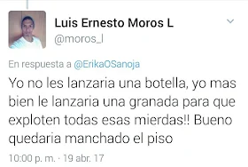 Además, en el momento de publicar este post, Almelina Carrillo, militante chavista, se debate entre la vida y la muerte tras recibir el pasado día 19 de abril un botellazo en la cabeza arrojado desde un edificio. Se trataba de una botella de agua congelada.