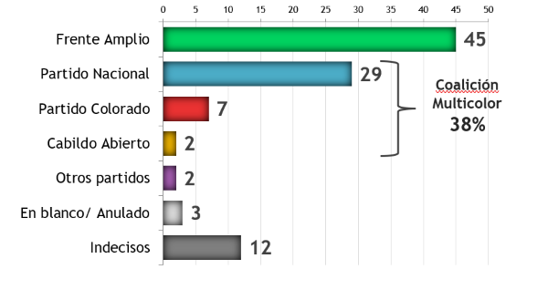 El 45% respondió que lo haría por el Frente Amplio, 29% por el Partido Nacional, 7% por el Partido Colorado, 2% por Cabildo Abierto, y 2% menciona otros partidos (ninguno de los cuales alcanza al 1% individualmente).