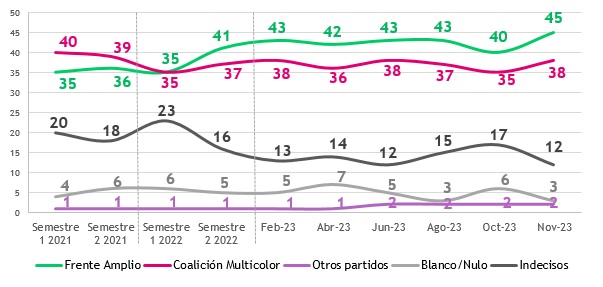 De acuerdo al análisis de Equipos, cuando se estudia la evolución de mediano plazo se aprecia que, si 2021 fue un año levemente favorable a la Coalición Multicolor, y 2022 fue un año de cambio (las rectas se cruzaron en el segundo semestre), 2023 ha sido un año de sostenimiento de la diferencia a favor del Frente Amplio. Esto coloca a la coalición de izquierda en un buen lugar en la antesala del año electoral, aunque aún falta mucho tramo por recorrer.