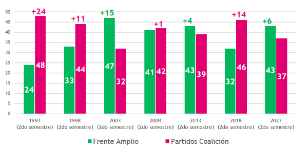 Hubo dos elecciones (2009 y 2014), donde las diferencias en lo previo eran menores y ambas tuvieron desenlace similar, con triunfo del Frente Amplio. Es decir que, en esos dos escenarios inicialmente más competitivos, el Frente Amplio logró durante el año electoral inclinar la balanza a su favor.