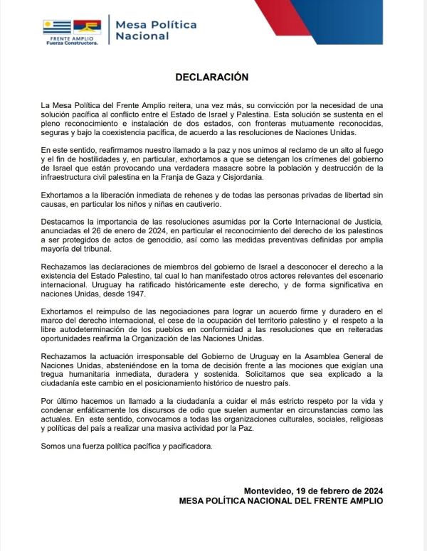 La Mesa Política Nacional del Frente Amplio divulgó una declaración donde señala la necesidad de una solución pacífica al conflicto que enfrenta en Medio Oriente al estado de Israel y Palestina.